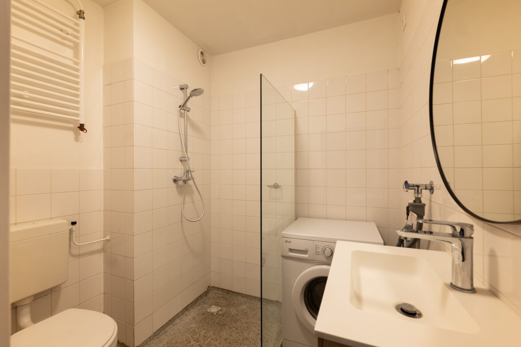 De badkamer is compact en uitgerust met douche, wastafel, toilet en aansluiting voor wasmachine. Daarnaast is er een separaat tweede toilet. De woning is goed onderhouden en voorzien van moderne installaties, waaronder een Intergas CV-ketel uit 2019.