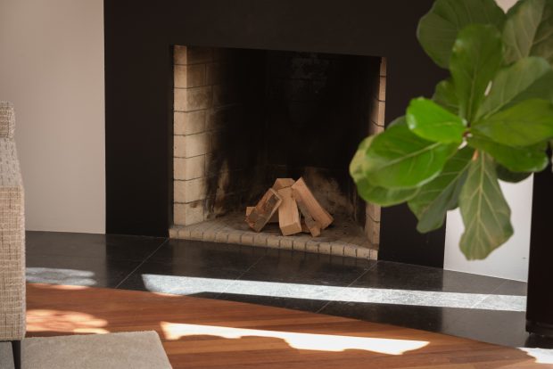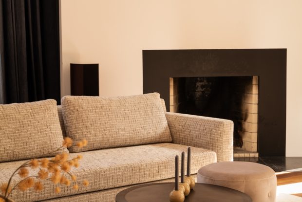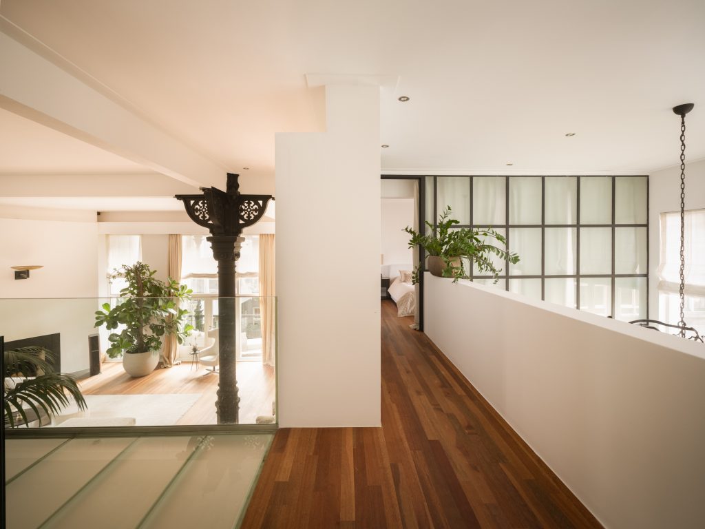 Woonkamer: Een zonovergoten ruimte met ruim 5.5 meter hoge plafonds, gietijzeren zuilen, open haard en toegang tot een royaal balkon op het zuiden met uitzicht op de binnentuin.