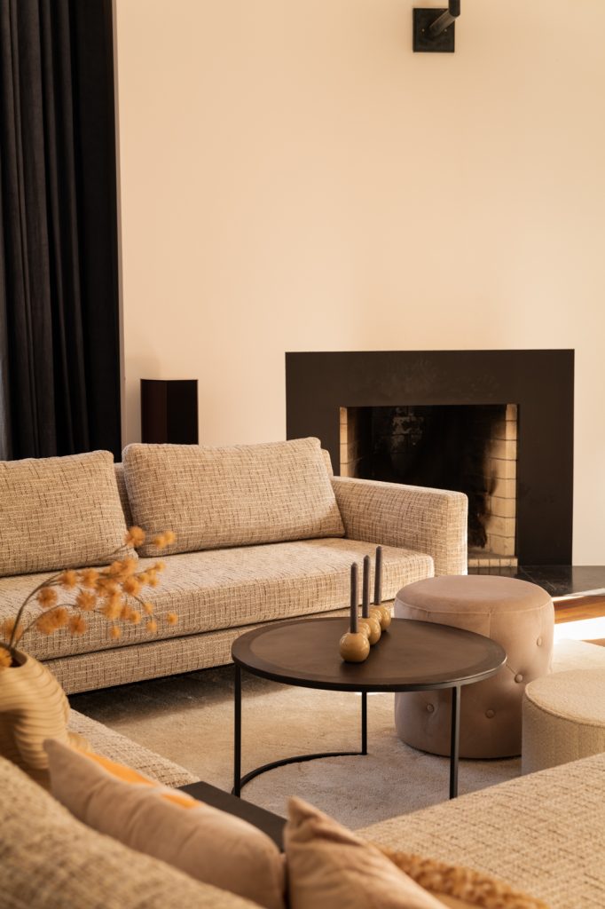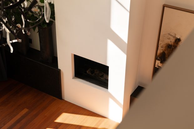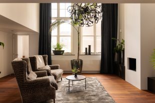 Living: Een indrukwekkende ruimte met hoog plafond, grote ramen, een gas open haard en een entresol met werkkamer. Ideaal voor zakelijke bijeenkomsten of als zelfstandige studio.