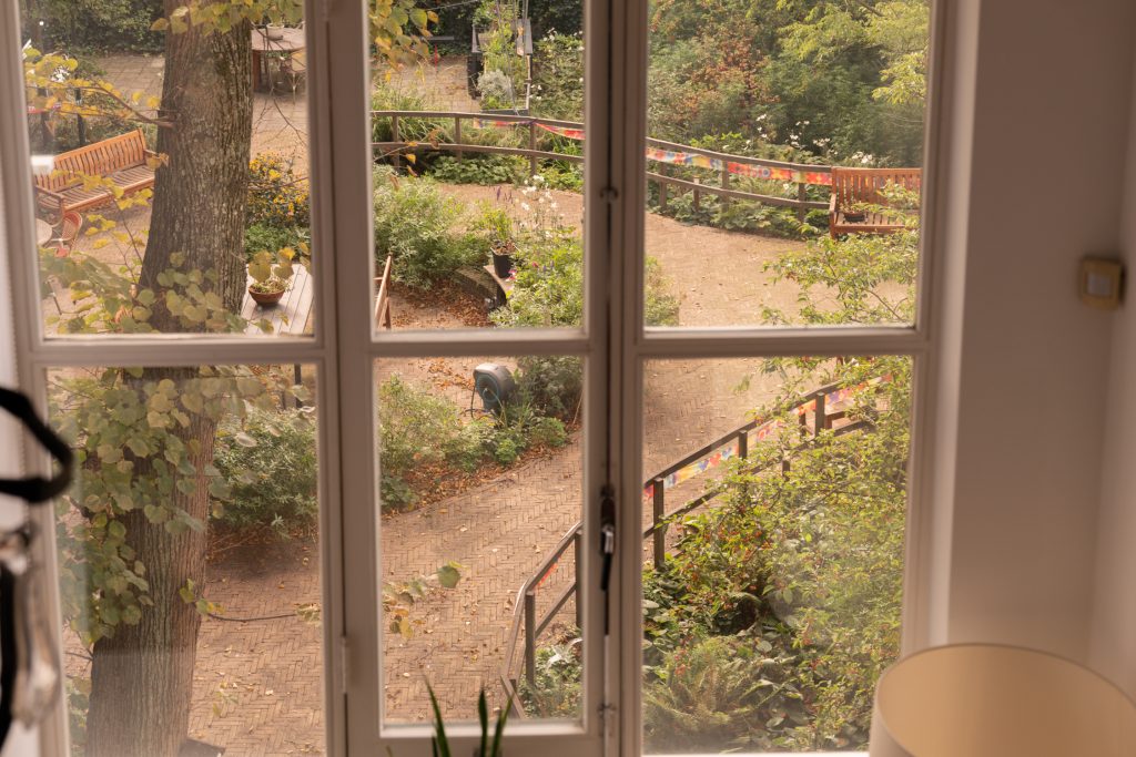 Het appartement bevindt zich aan de achterzijde van het gebouw, waardoor het volledig gevrijwaard is van straatgeluid. Wat rest is het rustgevende geluid van vogels uit de omliggende binnentuinen. Aan drie zijden bieden de vele raampartijen uitzicht op groene fraai aangelegde tuinen, waaronder de binnentuin van het voormalige klooster met schitterende kapel van architect Bleys, en de tuin van zorgcomplex De Uylenburgh.