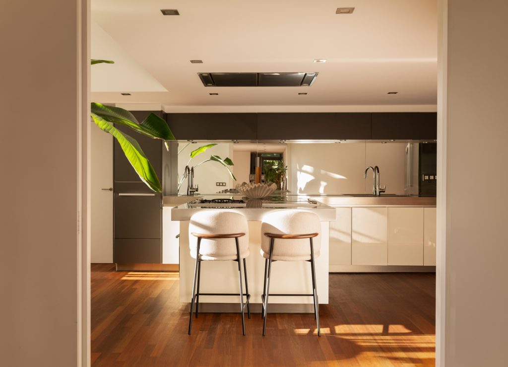 De eetkamer biedt ruimte voor een groot gezelschap, met veel ingebouwde bergruimte en directe verbinding met de keuken.