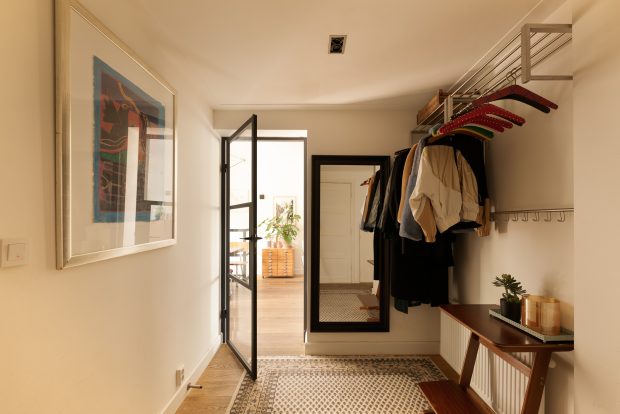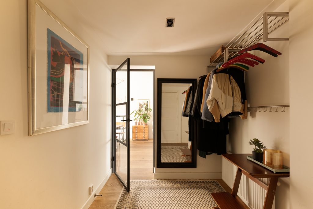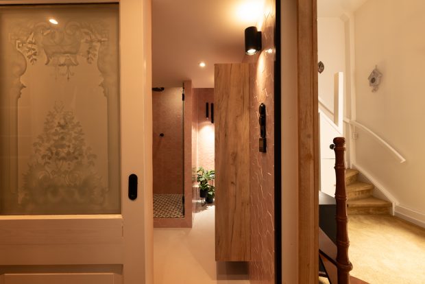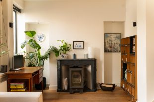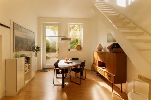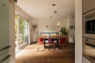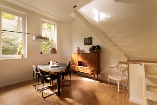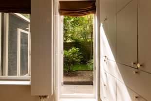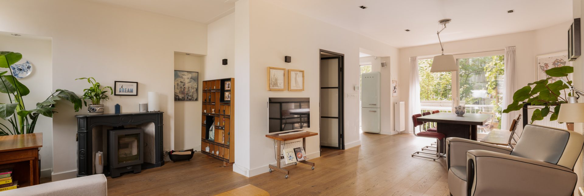 Een matzwarte stalen deur opent naar de royale woonkamer die zich, over vijf ramen breed, uitstrekt aan de voorzijde. Het geoliede eikenhouten parket, hoge plafonds en de haard zorgen voor warmte en sfeer. Subtiele verlichting met inbouwspots en dimbare LED-wandlampen maken het geheel compleet. Aan de achterzijde openen dubbele deuren naar het balkon op het zuiden, dat een mooi zicht geeft op de tuin.