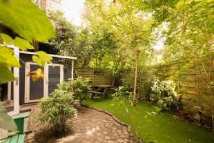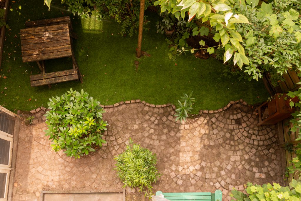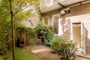 Achter de woning ligt een beschutte, zonnige tuin van ca. 40 m², gelegen op het zuiden. Dankzij de volwassen begroeiing en het niveauverschil met de straat biedt de tuin veel privacy en een groene ambiance. De tuin is vanuit meerdere vertrekken in het souterrain toegankelijk (momenteel via één kamer, met mogelijkheid om een tuindeur te maken vanuit de tweede werkkamer), wat zorgt voor een natuurlijke verbinding tussen binnen en buiten.