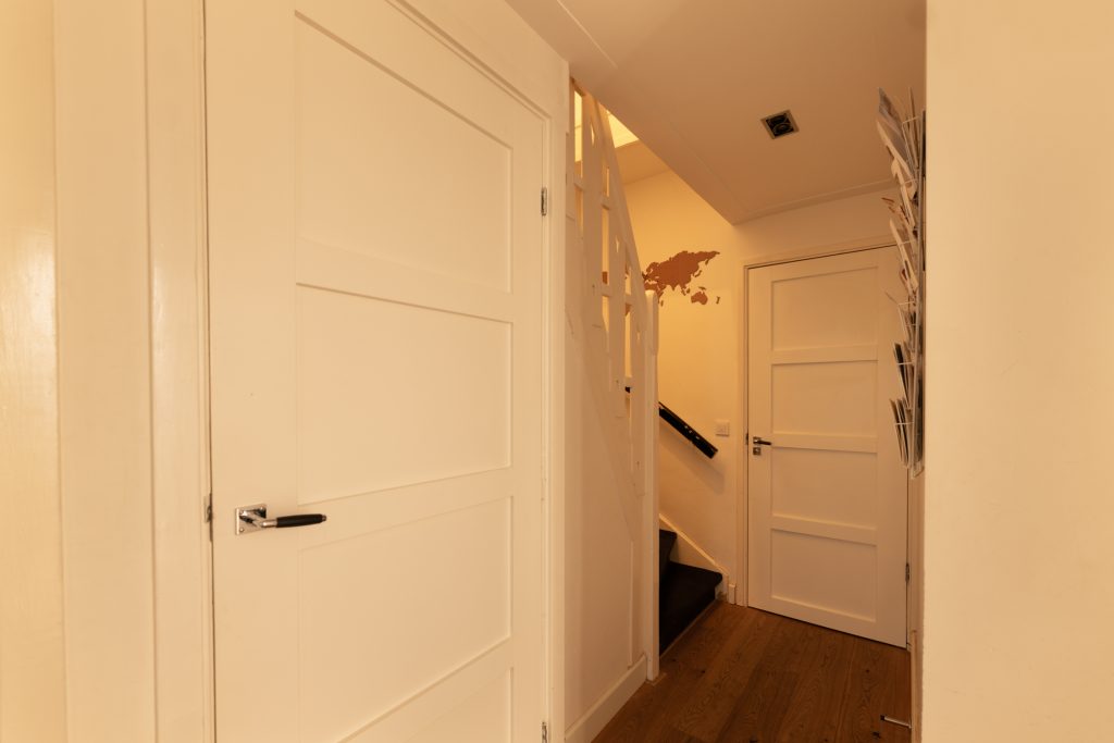 De centrale hal is een functioneel knooppunt met twee ruime bergkasten en een gastentoilet. Dit toilet is voorzien van doucheaansluitingen, waardoor hier eenvoudig een derde badkamer kan worden gerealiseerd.