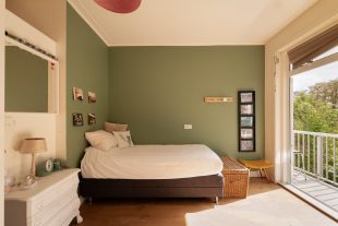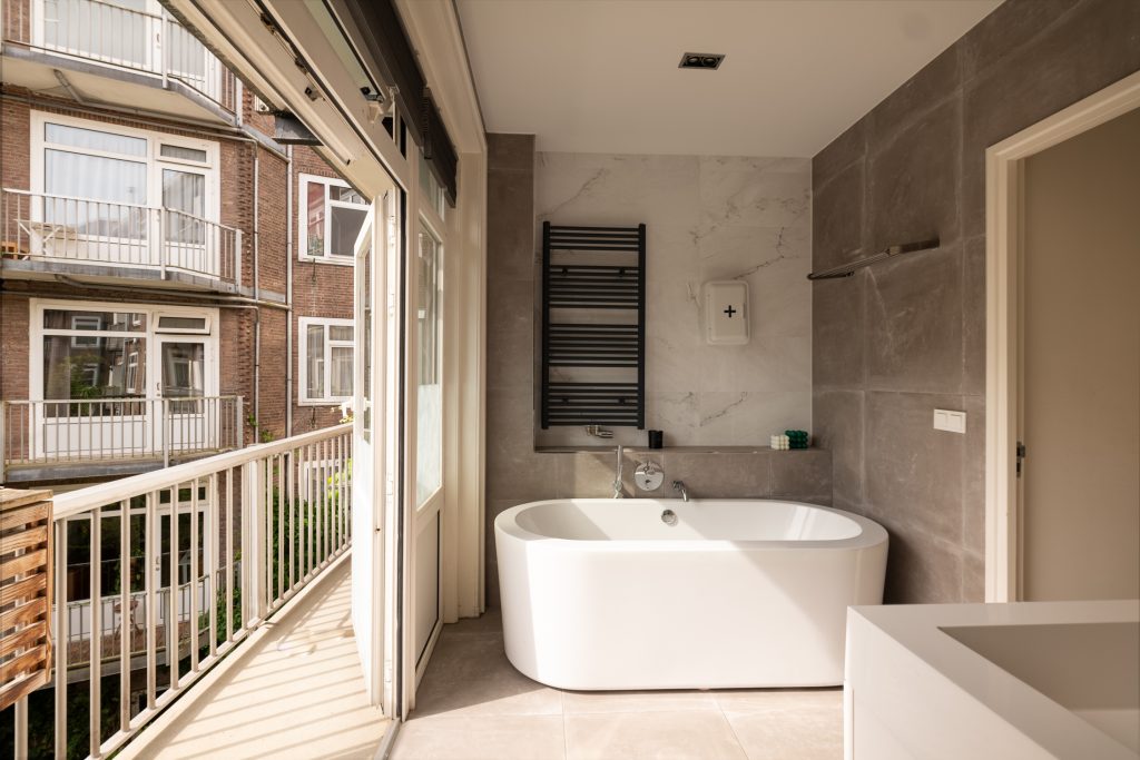 De bovenverdieping biedt momenteel drie volwaardige slaapkamers, maar is eenvoudig uit te breiden naar vier kamers. Aan de achterzijde ligt de ouderslaapkamer met toegang tot een balkon op het zuiden en uitzicht op de groene binnentuinen. De badkamer grenst eveneens aan dit balkon en is uitgerust met een vrijstaand bad, dubbele wastafel, inloopdouche en vloerverwarming.