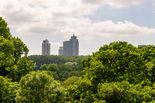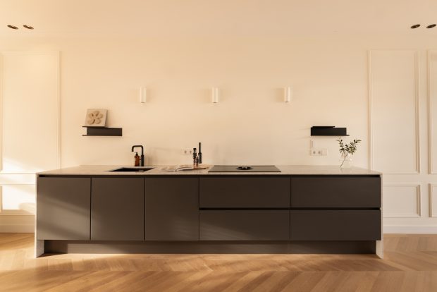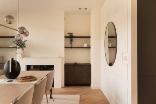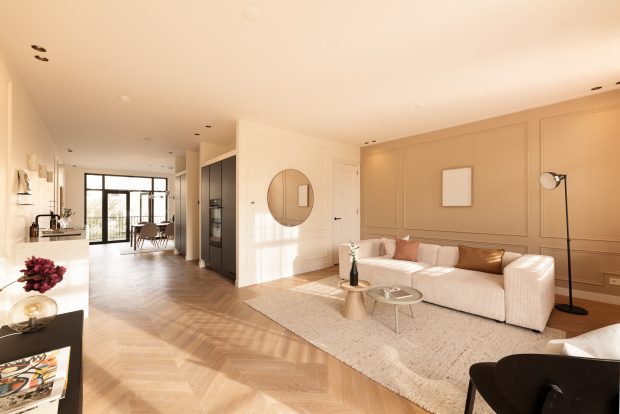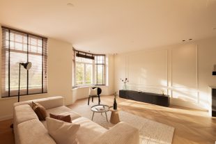 De woning is bereikbaar via het trappenhuis of de lift met directe privétoegang. De tweede verdieping opent met een ruime hal die leidt naar de lichte woonkamer met hoge plafonds, een charmante erker en grote raampartijen met vrij uitzicht over het park. Centraal ligt de moderne open keuken met marmeren blad, kookeiland en AEG-inbouwapparatuur, waaronder een inductiekookplaat met geïntegreerde afzuiging, oven, koel-vriescombinatie, wijnklimaatkast en Quooker. Aan de achterzijde bevindt zich het eetgedeelte met gashaard en openslaande deuren naar het balkon van circa 12 m² op het oosten, een heerlijke plek voor een ontspannen ochtend.