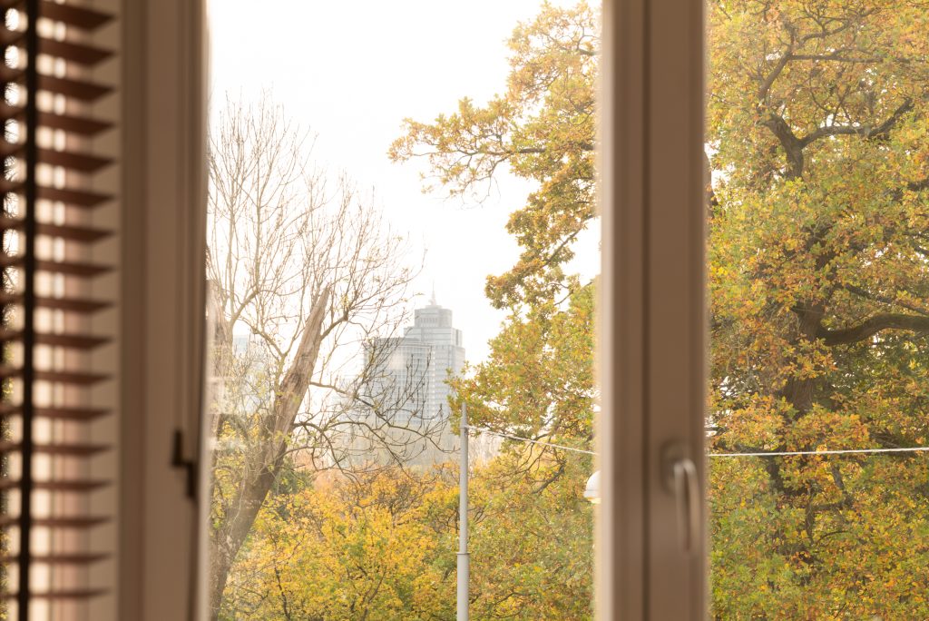 De woning is bereikbaar via het trappenhuis of de lift met directe privétoegang. De tweede verdieping opent met een ruime hal die leidt naar de lichte woonkamer met hoge plafonds, een charmante erker en grote raampartijen met vrij uitzicht over het park. Centraal ligt de moderne open keuken met marmeren blad, kookeiland en AEG-inbouwapparatuur, waaronder een inductiekookplaat met geïntegreerde afzuiging, oven, koel-vriescombinatie, wijnklimaatkast en Quooker. Aan de achterzijde bevindt zich het eetgedeelte met gashaard en openslaande deuren naar het balkon van circa 12 m² op het oosten, een heerlijke plek voor een ontspannen ochtend.