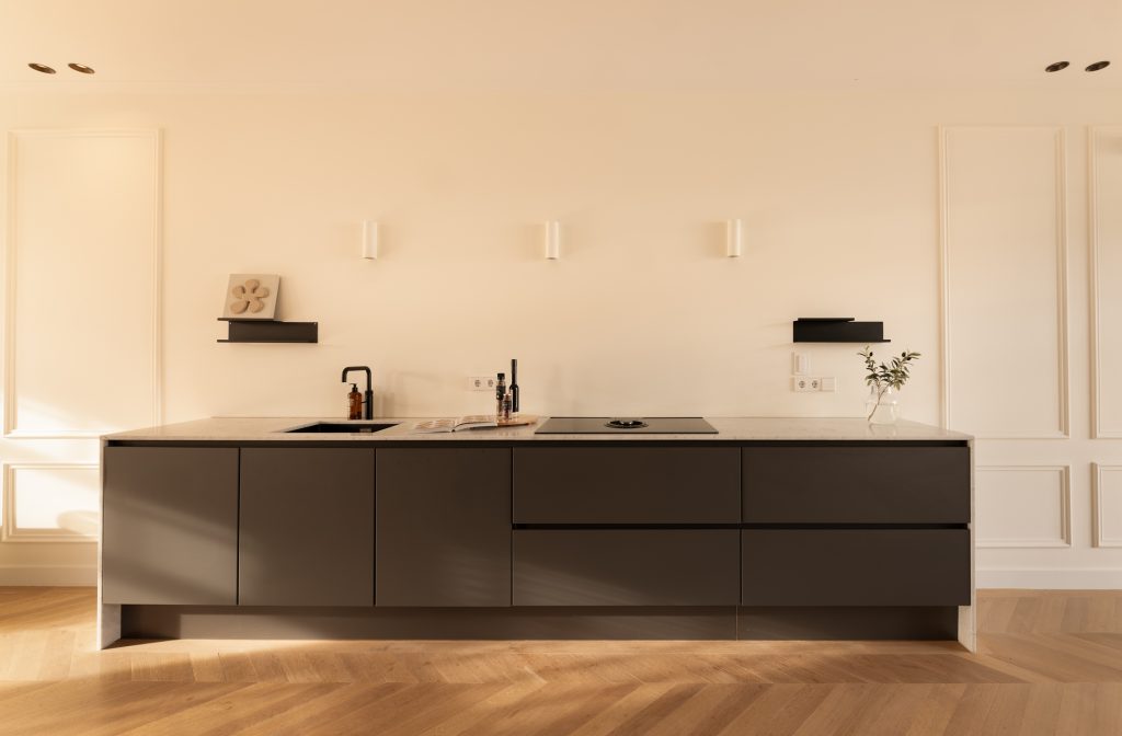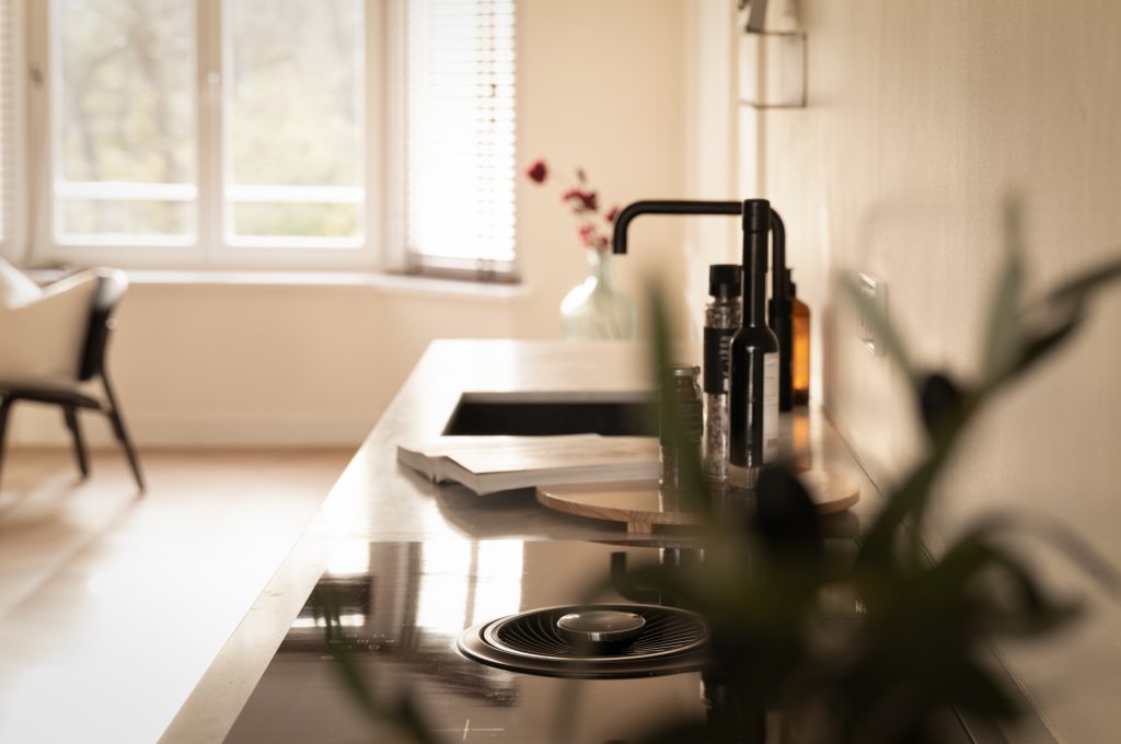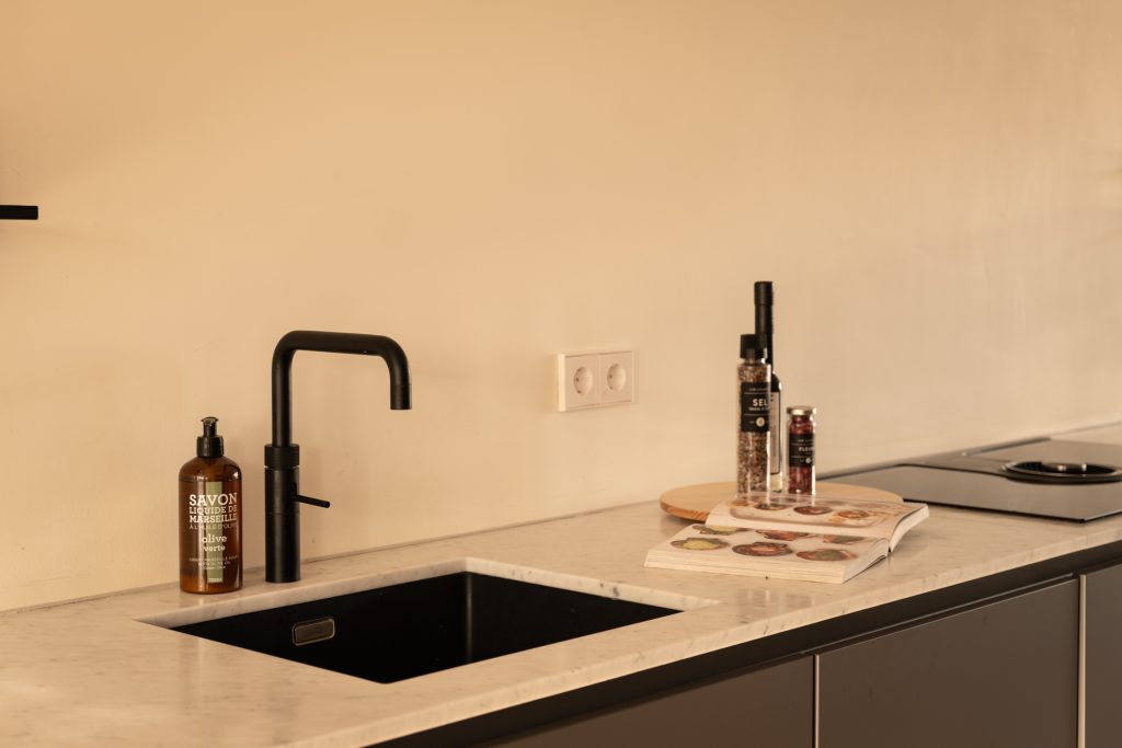– Luxe keuken met marmeren blad en AEG-apparatuur;