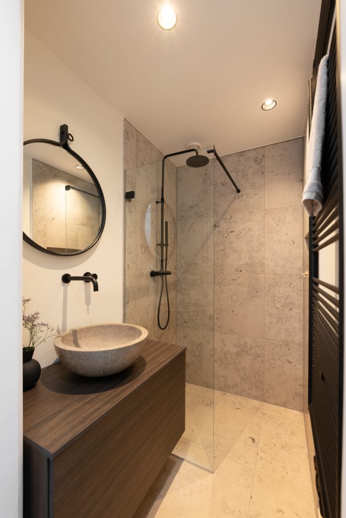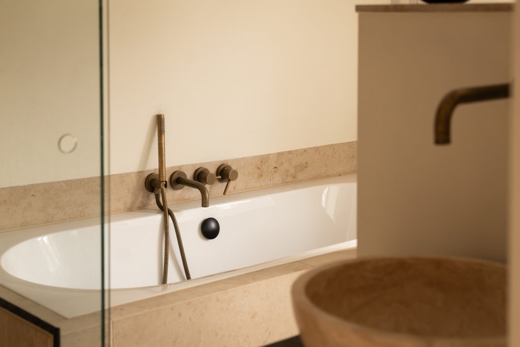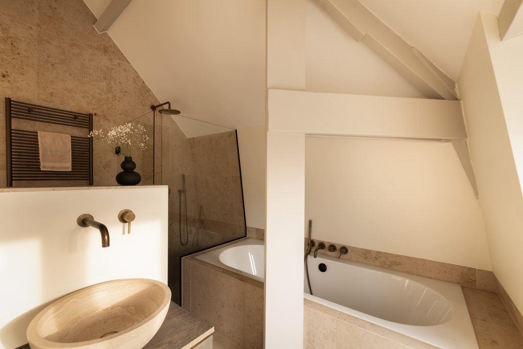 Op de derde verdieping bevinden zich vier goed bemeten slaapkamers, alle voorzien van airconditioning. De master bedroom beschikt over een en-suite badkamer met vrijstaand ligbad, inloop(regen)douche en dubbele wastafel, afgewerkt met natuursteen en messing Bongio-kranen. Daarnaast is er een tweede badkamer met inloopdouche, wastafel en separaat toilet. Slim geplaatste inbouwkasten en bergruimtes zorgen voor optimaal gebruiksgemak.