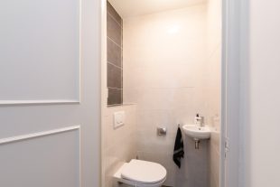 Aan de hal liggen de twee slaapkamers en de ruime badkamer. De master bedroom is licht en ruim van opzet waarbij de grote ramen zorgen voor een mooie verbinding met buiten. De tweede slaapkamer beschikt over een praktische vaste kast met de wasmachine- en drogeraansluiting. De badkamer is uitgevoerd in een tijdloze combinatie van neutrale kleuren en hoogwaardige materialen. Er is een dubbele wastafel, een handdoekradiator, een douche en een ligbad.