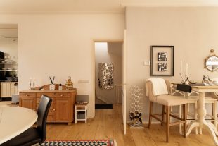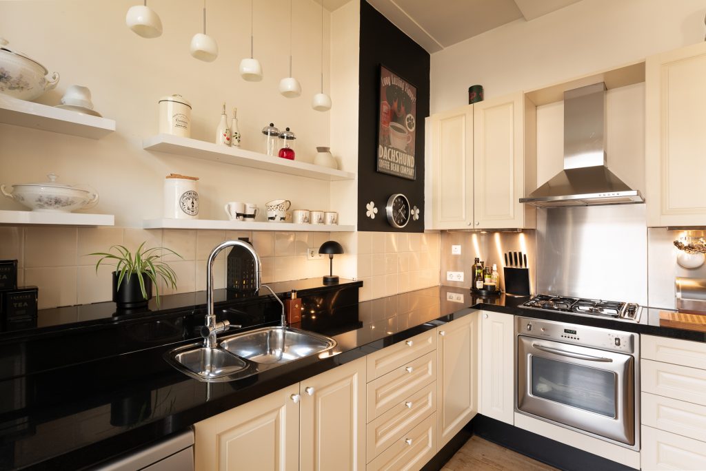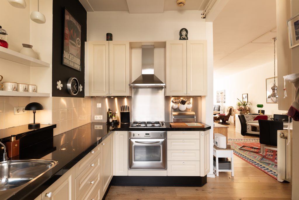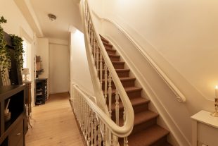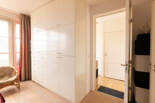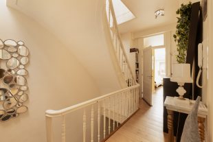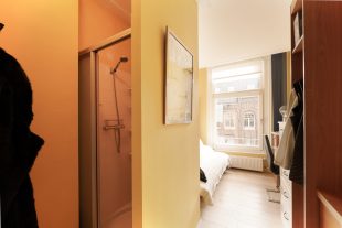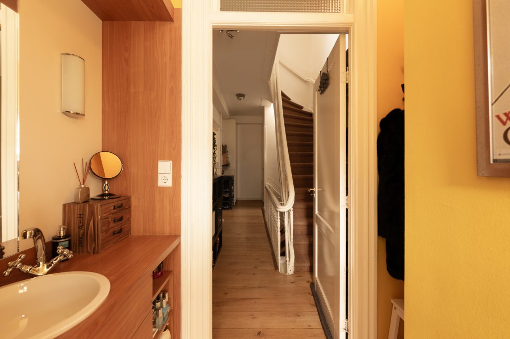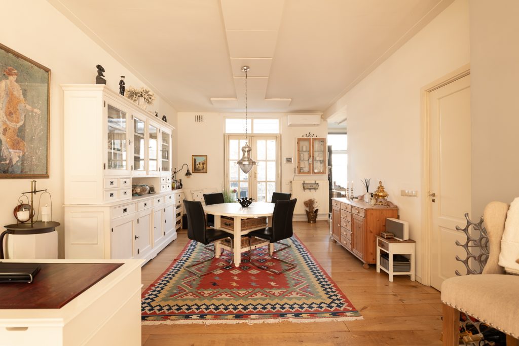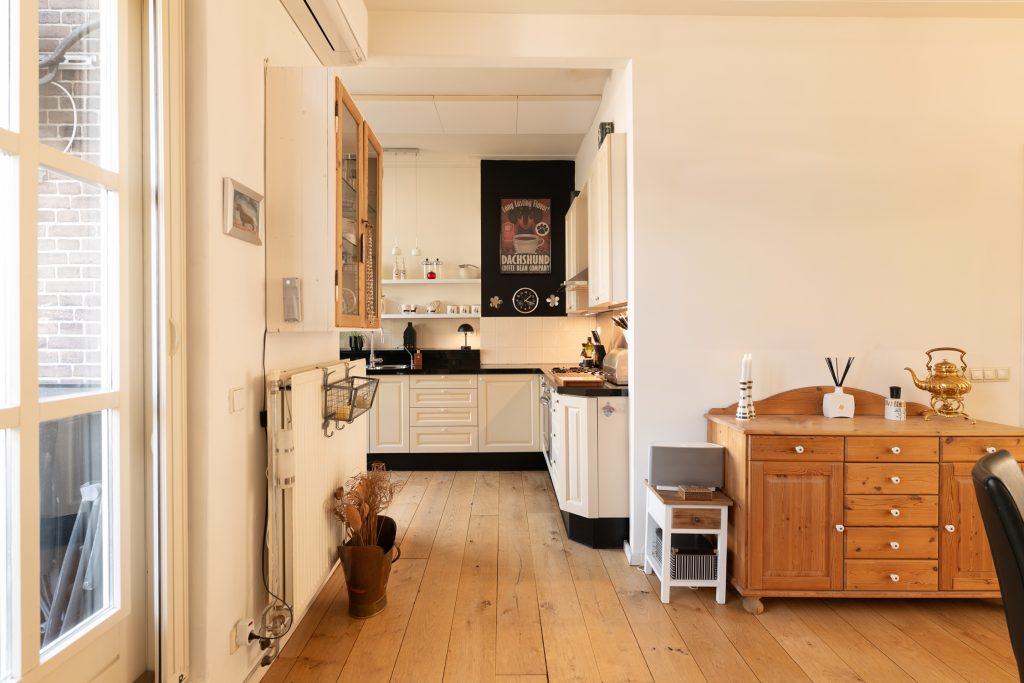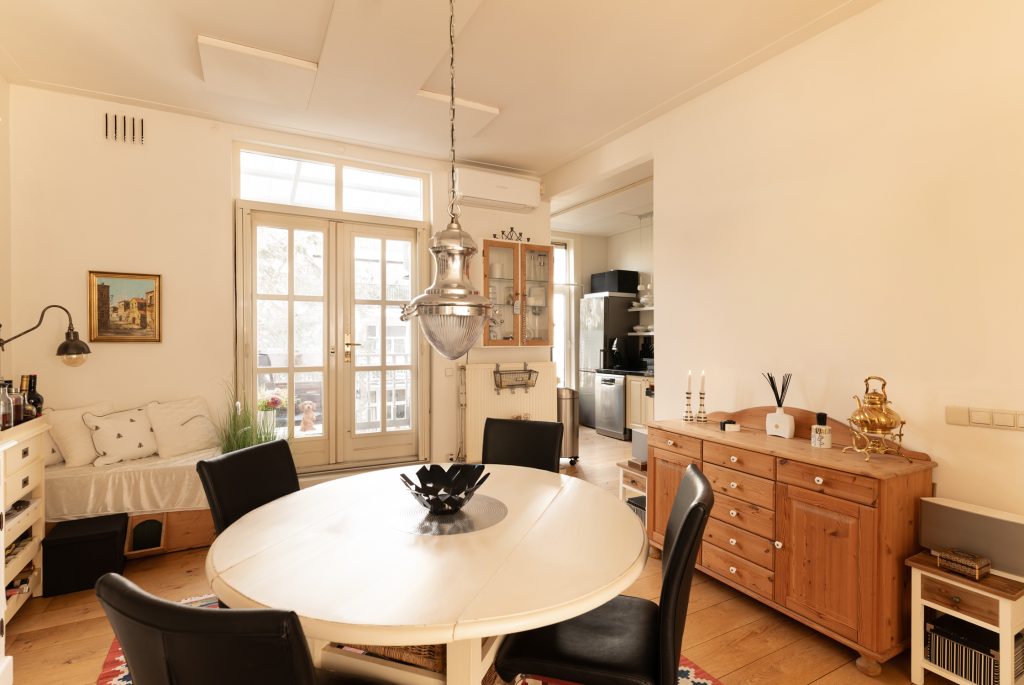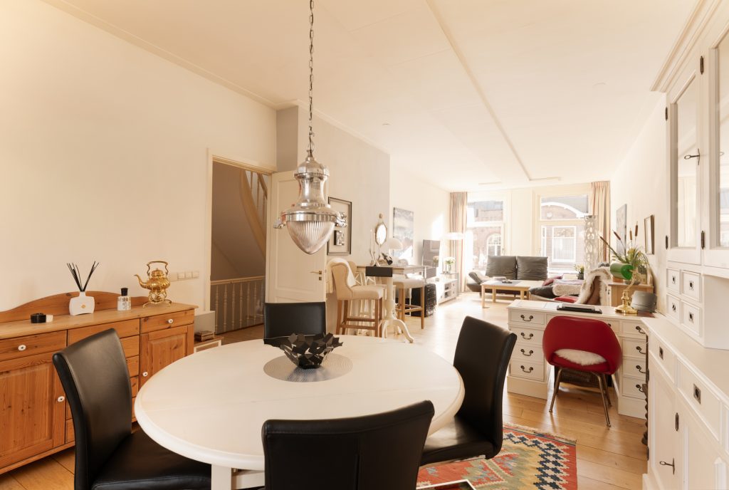 De entree bevindt zich op de tweede verdieping, bereikbaar via de gemeenschappelijke opgang. Een interne trap leidt naar de derde verdieping, waar een lichte hal met garderoberuimte en toilet u verwelkomt. De woonkamer strekt zich uit over de volledige lengte van het appartement en is voorzien van een prachtige houten vloer. De royale plafondhoogte van bijna 3 meter en grote ramen zorgen voor een bijzonder gevoel van ruimte en licht. Aan de voorzijde een sfeervol zitgedeelte met uitzicht op de straat, aan de achterzijde een eetkamer met openslaande deuren naar het balkon. Hier is het heerlijk toeven in de ochtendzon. De luxe open woonkeuken, uitgerust met diverse inbouwapparatuur, vormt het hart van deze verdieping en nodigt uit tot koken en samenzijn. Aan de voorzijde bevindt zich een slaap-/werkkamer met douche en een op maat gemaakte kast met wastafel, ideaal als logeerkamer of thuiskantoor.