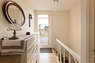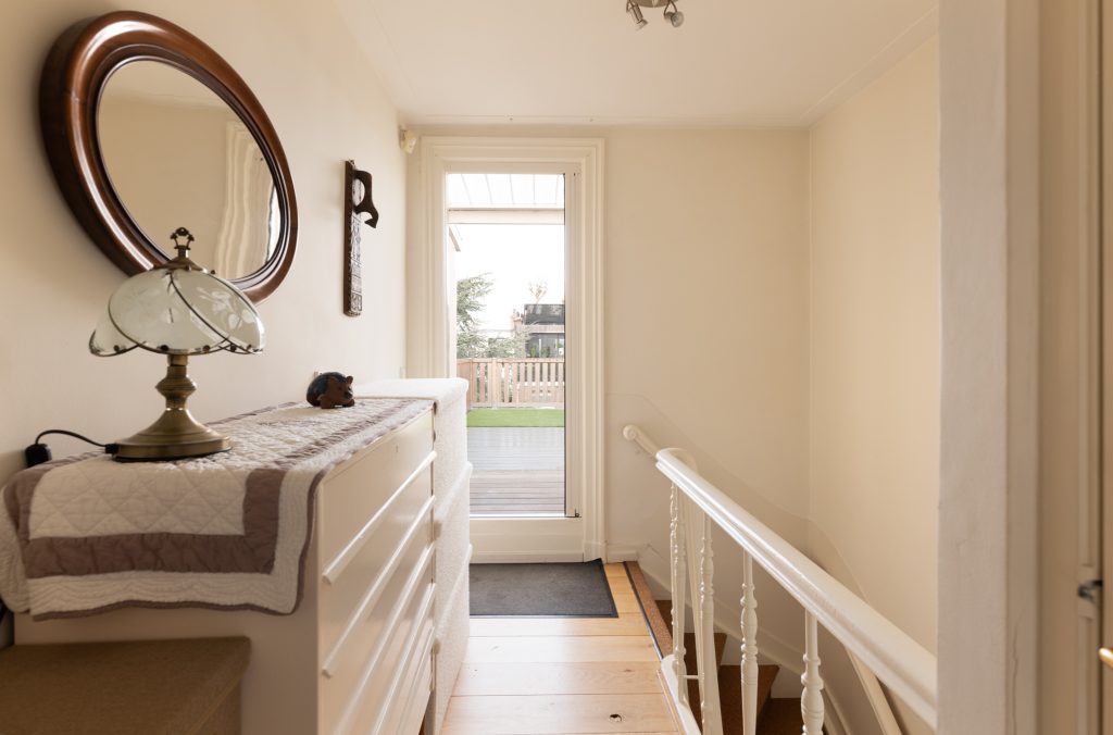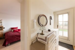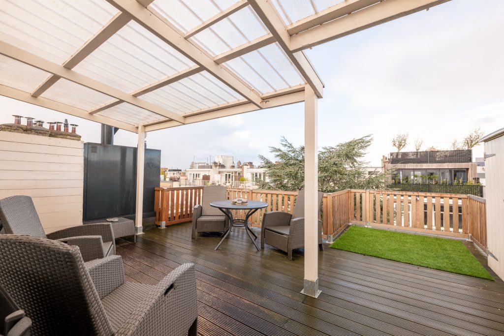 De vierde verdieping is bereikbaar via een vaste trap. Hier vindt u een lichte overloop, bergkast met CV-opstelling, de ruime master bedroom met walk-in closet en openslaande deuren naar het royale dakterras. Dit terras van circa 32 m² biedt volop privacy, zon en een prachtig uitzicht over de stad. Een plek om te ontspannen, te dineren of te genieten van lange zomeravonden. Tevens bevindt zich hier de ruime badkamer compleet uitgerust met ligbad, inloopdouche, dubbele wastafels, toilet en aansluitingen voor was- en droogmachine.