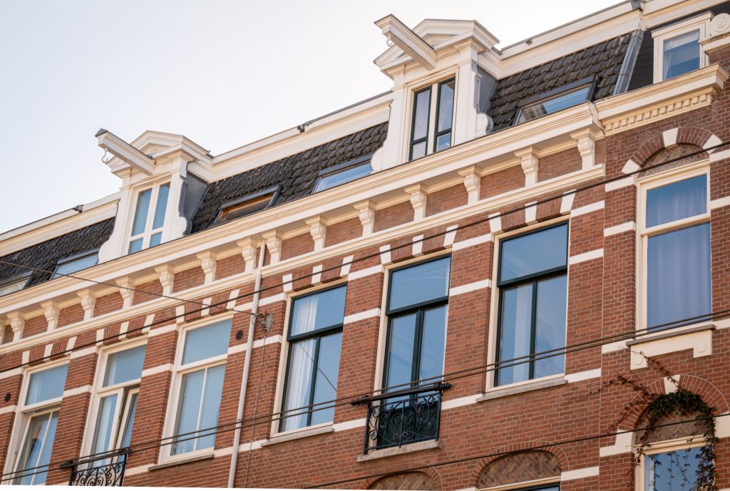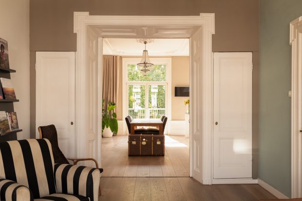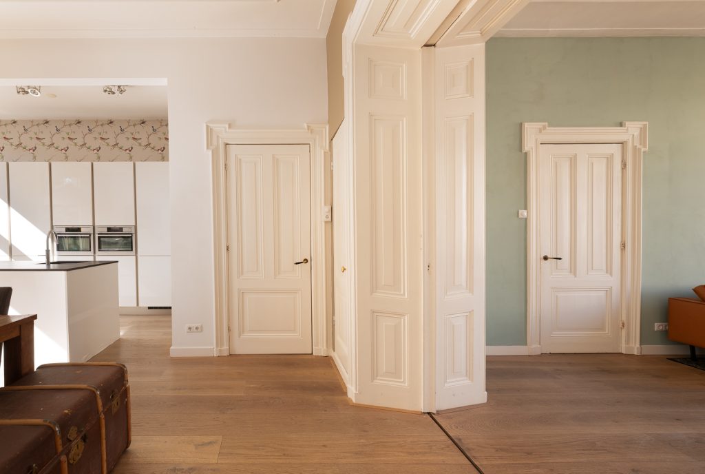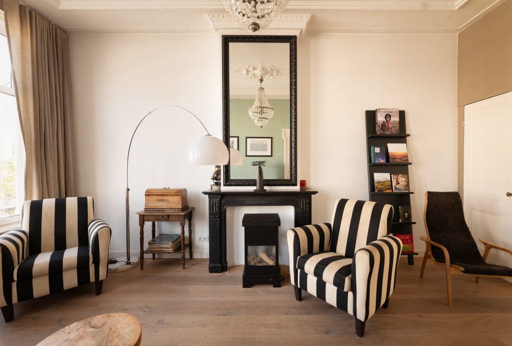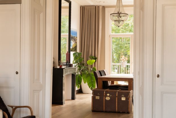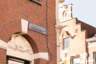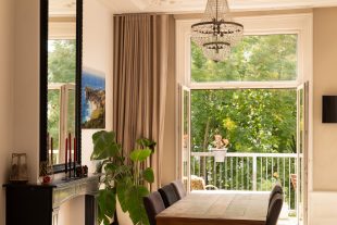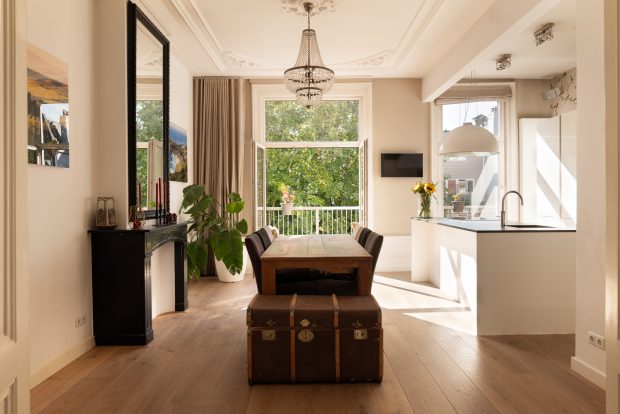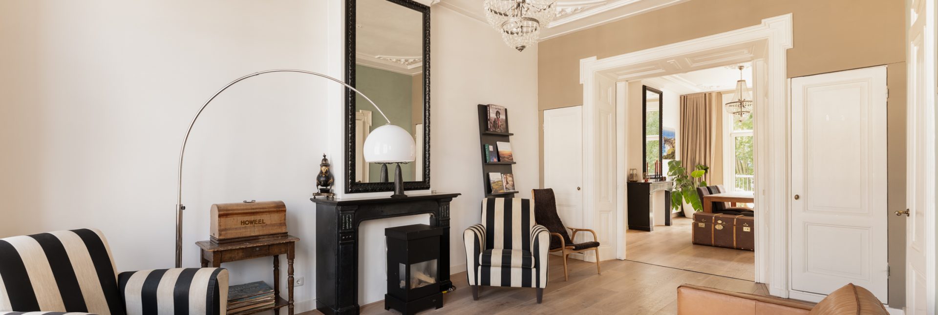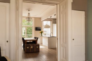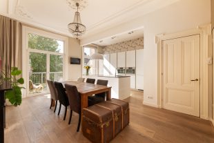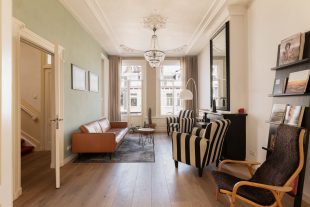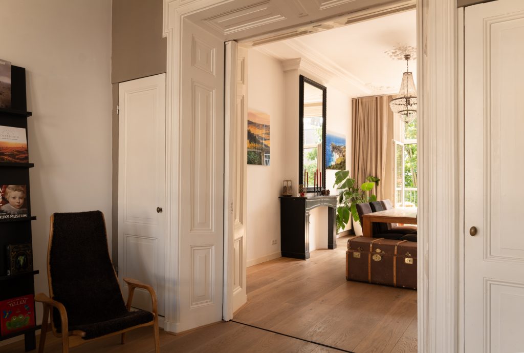 Via de eigen entree betreed je de woonverdieping, waar direct het licht en de hoogte van de plafonds opvallen. Aan de voorzijde bevindt zich een sfeervolle woonkamer met grote raampartijen die uitkijken op de levendige Ruyschstraat. De originele charme van het huis is prachtig behouden: kamer-en-suite deuren, houten lambriseringen en decoratieve plafondornamenten geven de ruimte een statige uitstraling.