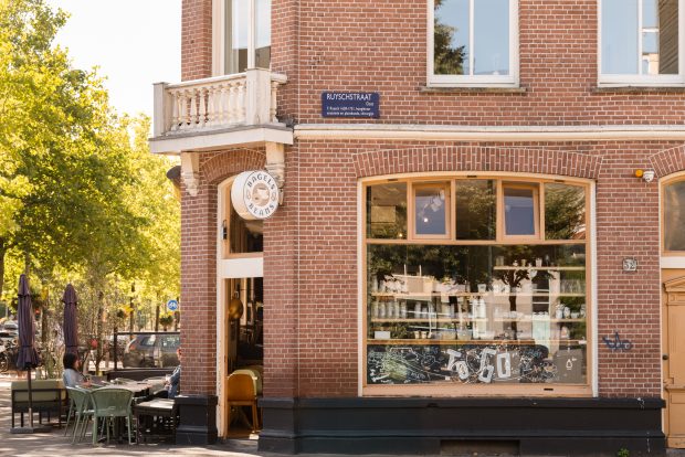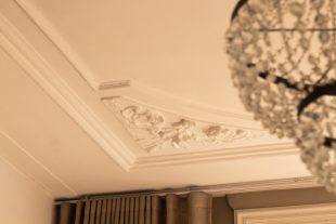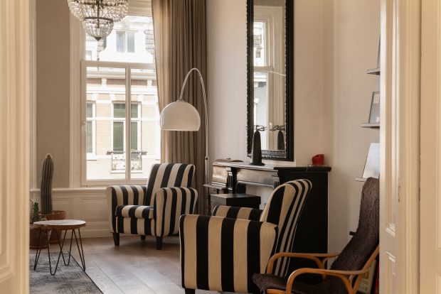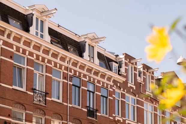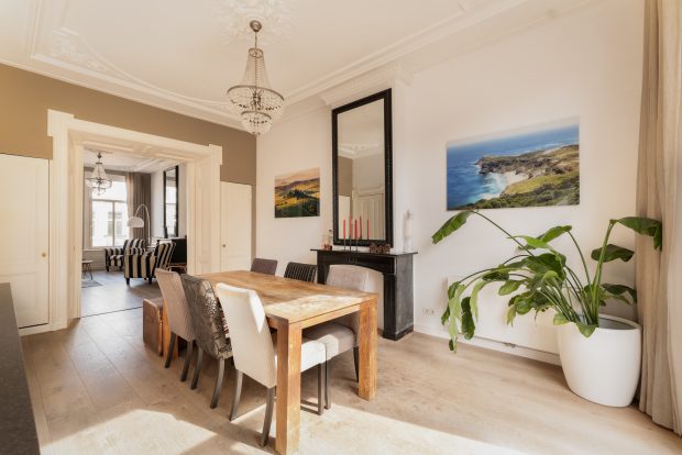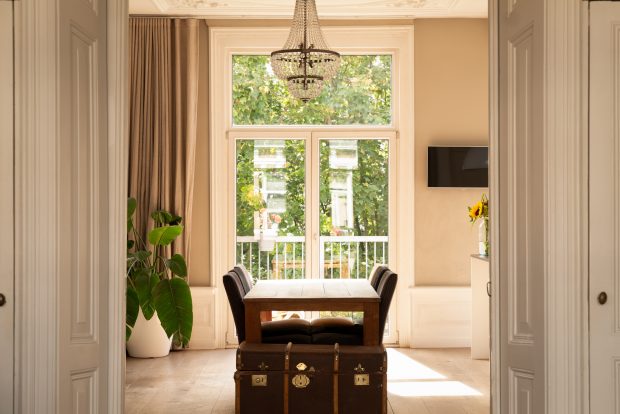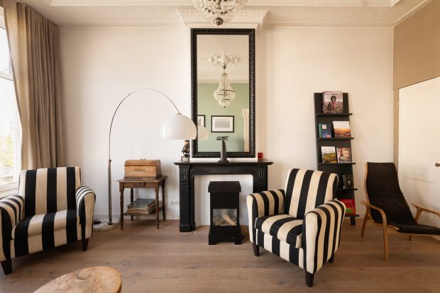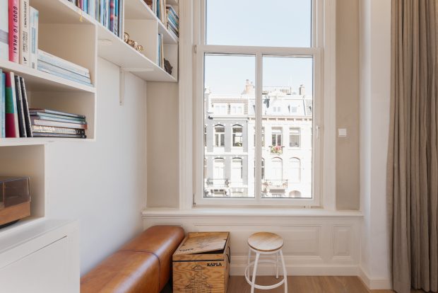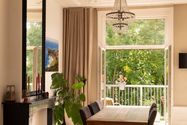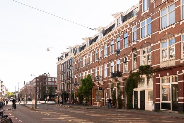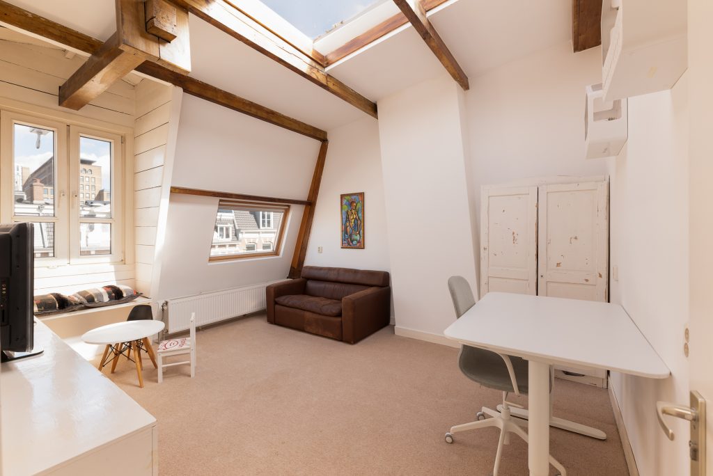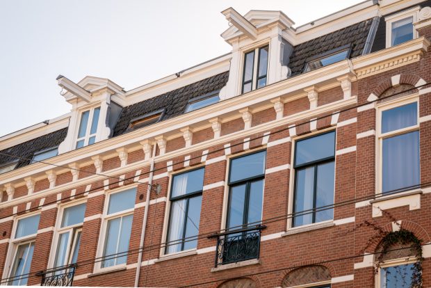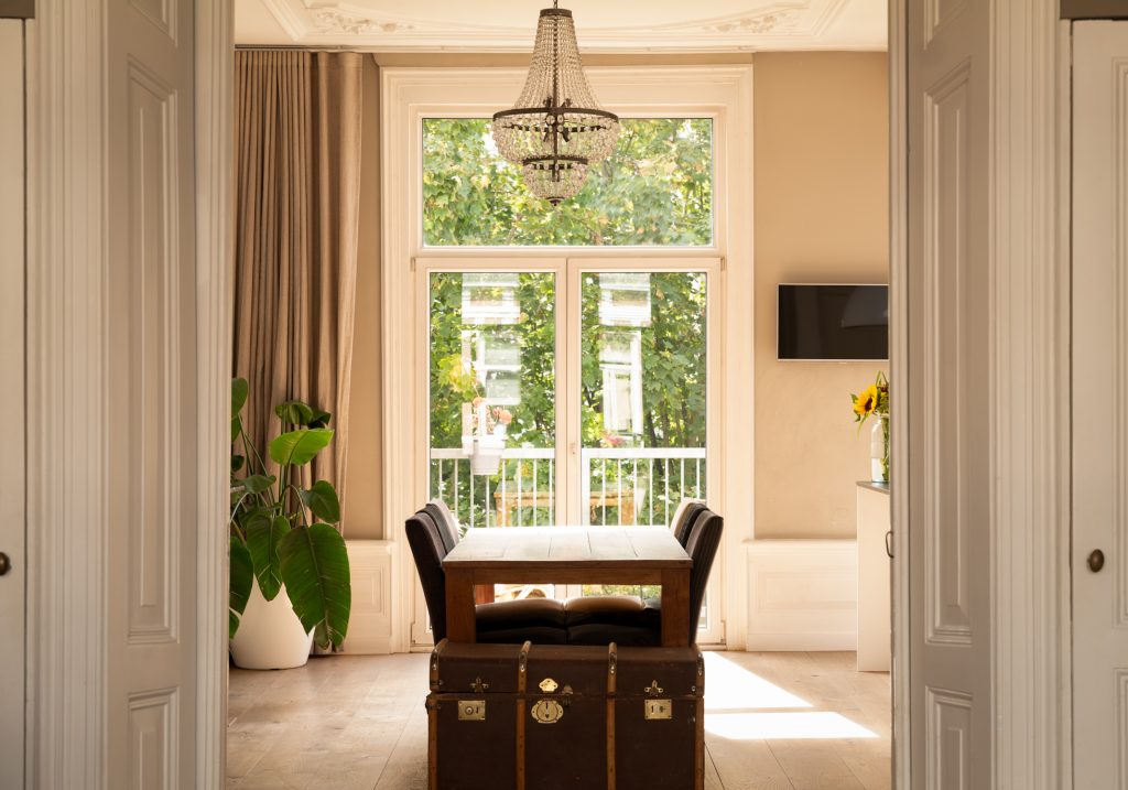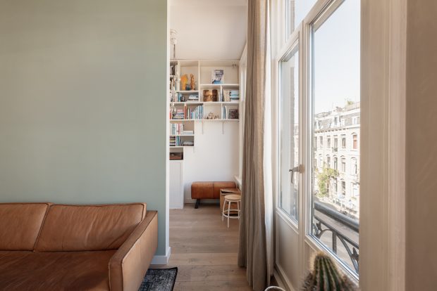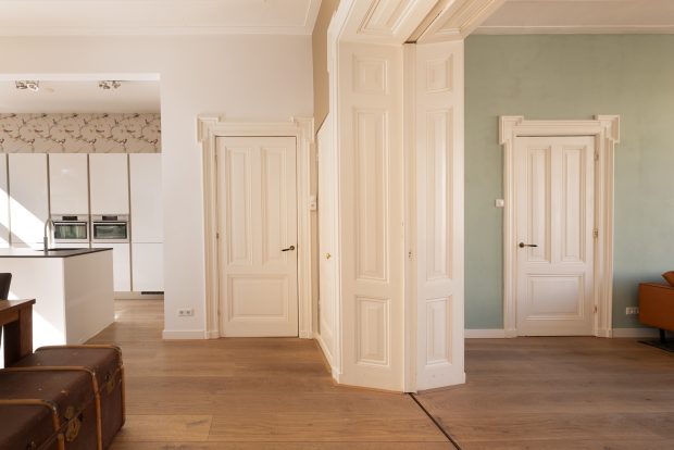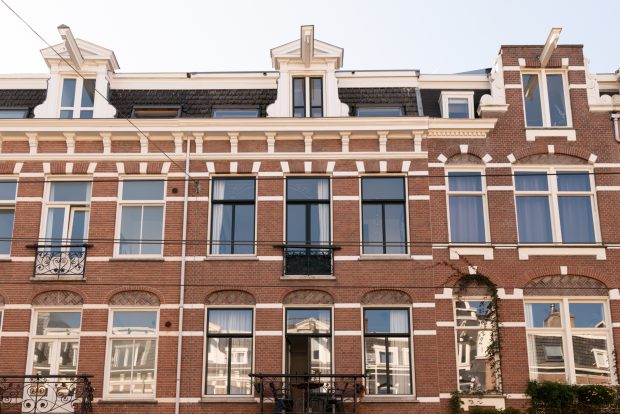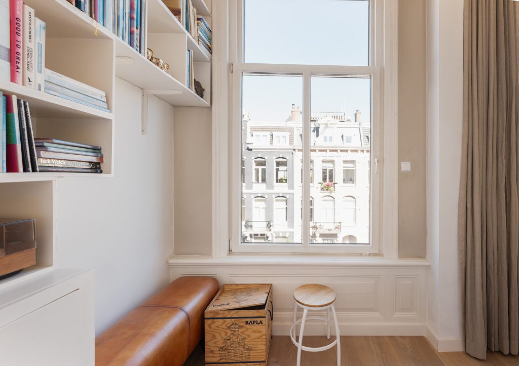 Via de eigen entree betreed je de woonverdieping, waar direct het licht en de hoogte van de plafonds opvallen. Aan de voorzijde bevindt zich een sfeervolle woonkamer met grote raampartijen die uitkijken op de levendige Ruyschstraat. De originele charme van het huis is prachtig behouden: kamer-en-suite deuren, houten lambriseringen en decoratieve plafondornamenten geven de ruimte een statige uitstraling.