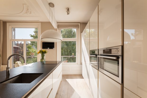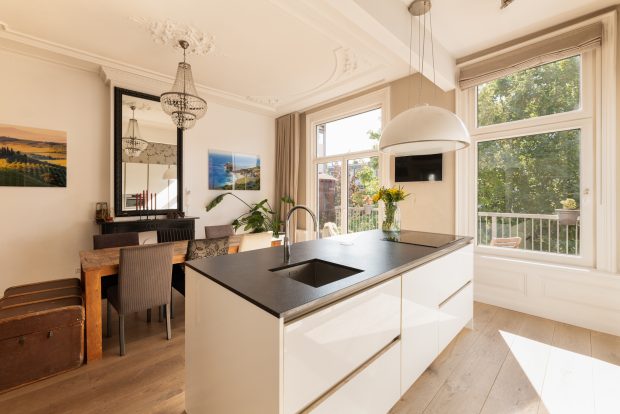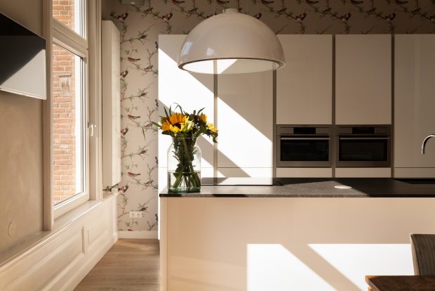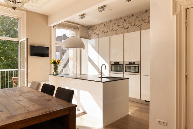 De moderne open keuken aan de achterzijde is voorzien van hoogwaardige inbouwapparatuur, zoals een Quooker kraan, twee ovens, Wave afzuigkap, vaatwasser, koel-vriescombinatie en een kookeiland dat uitnodigt tot samen koken en tafelen. Vanuit de keuken stap je direct via de grote openslaande deuren het ruime balkon op, gelegen op het zuiden – een rustige plek met zon in de middag en avond. Op deze verdieping bevindt zich ook een separaat toilet.