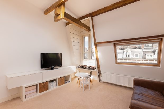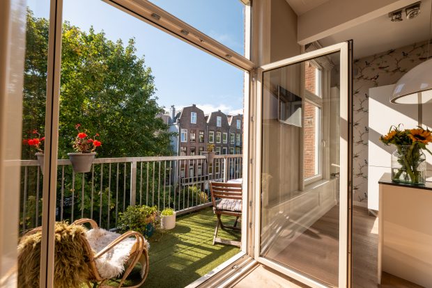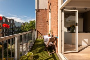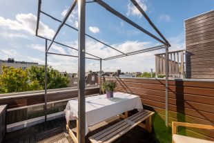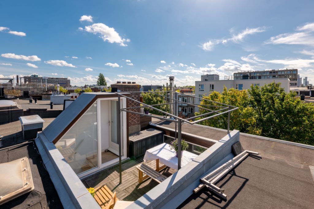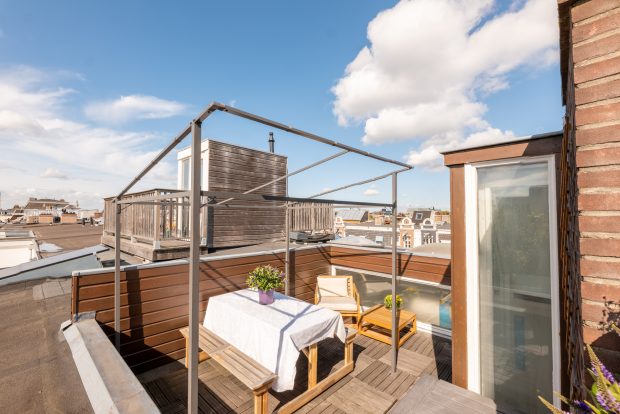 Via een vaste trap bereik je het verzonken privé dakterras – een zeldzame luxe in Amsterdam. Hier ontvouwt zich een panoramisch uitzicht over de stad en de Amstel. Een plek om te ontspannen, buiten te eten en te genieten van het buitenleven.