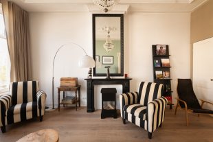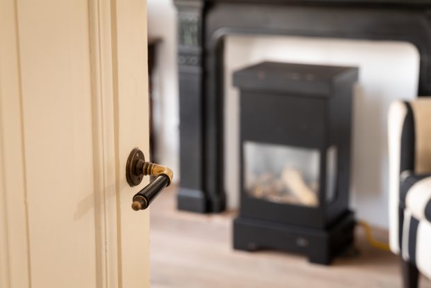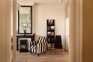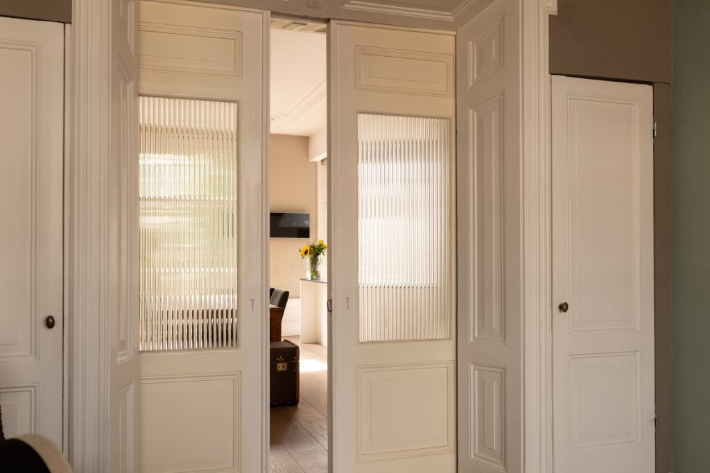 Aan de voorzijde grenst aan de woonkamer een ruimte, thans in gebruik als bibliotheek en werkruimte. De ensuite scheidt de zit- en eetkamer subtiel van elkaar en biedt tevens praktische bergruimte. De gashaard zorgt voor warmte en gezelligheid, terwijl de massief eikenhouten vloer de verdieping een warme basis geeft.