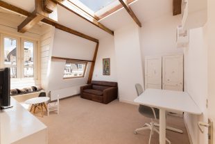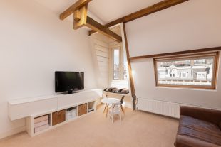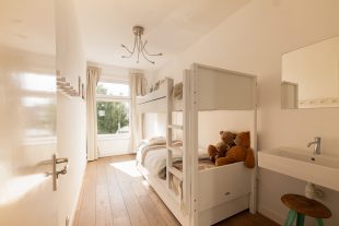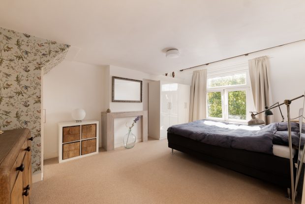 Een vaste trap leidt naar de slaapverdieping, waar rust en privacy centraal staan. De master bedroom aan de achterzijde biedt uitzicht op groene binnentuinen – een oase van stilte midden in de stad. Daarnaast ligt een tweede slaapkamer, praktisch in te delen als kinderkamer, logeer- of werkkamer.