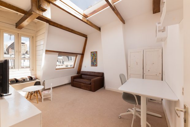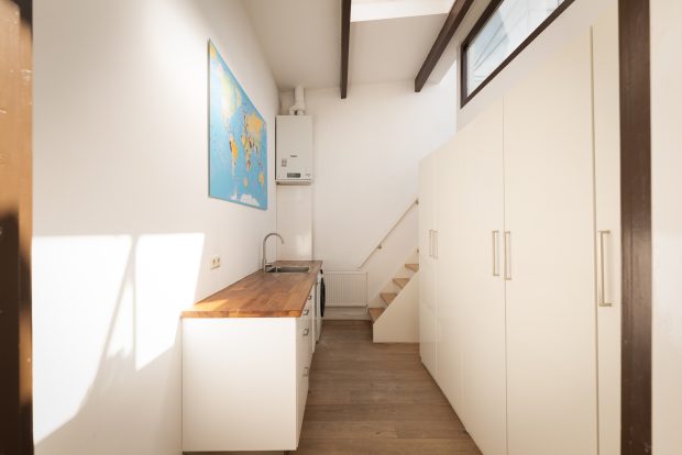 Aan de voorzijde bevindt zich een derde slaapkamer, gekenmerkt door hoge plafonds en originele balken, wat de ruimte een warme en authentieke uitstraling geeft. Tussen de slaapkamers in bevindt zich een tussenkamer met toegang tot het dakterras. Deze ruimte is praktisch ingericht met een pantry met koelkast, aansluitingen voor wasmachine en droger en de opstelplaats van de cv-ketel.