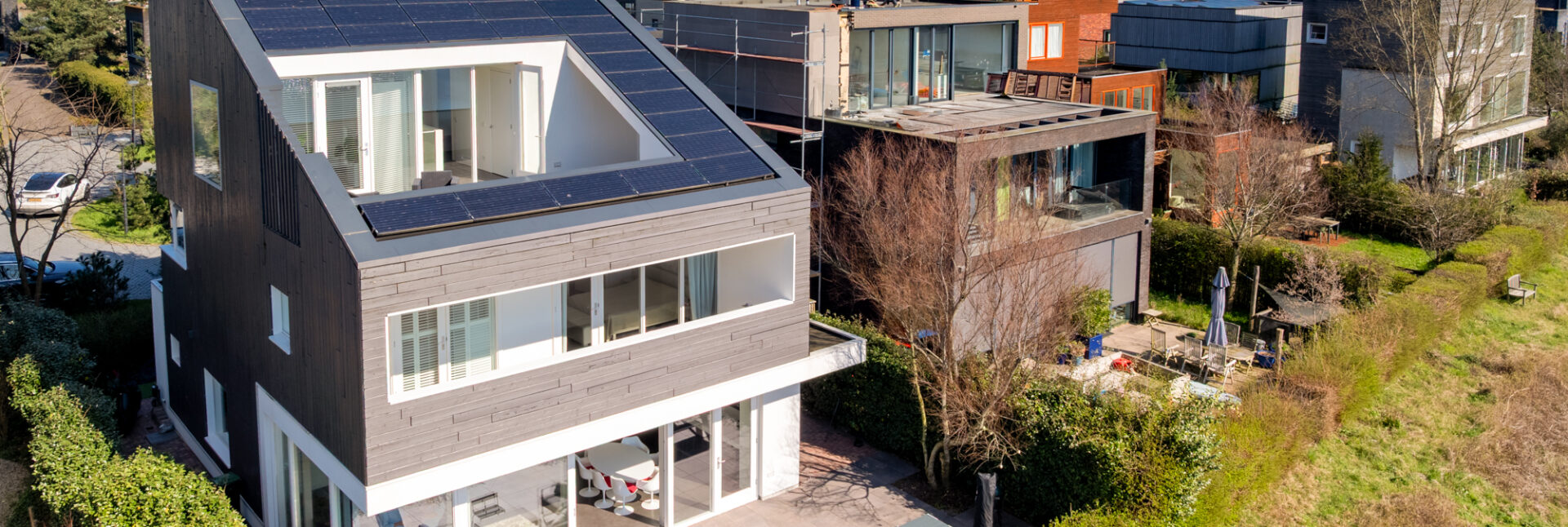 De architect is Knevel Architecten. Er is veel aandacht besteed aan lichtinval, zichtlijnen, mooie details en aan integratie van de zonnepanelen op het schuine dak. Het huis heeft veel bergruimte en voldoende plek om op een van de terrassen een sauna of buitenkeuken te realiseren.