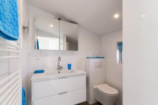 Op de eerste etage treft u een ruime slaapkamer (voorheen 2) met ingebouwde kasten en airconditioning. Aan deze slaapkamer grenst een comfortabele badkamer met inloopdouche, 2e toilet en wastafel. Bovendien beschikt de slaapkamer over een toegang tot het royale dakterras met een bijzonder vrij uitzicht op de plassen en de start toren.